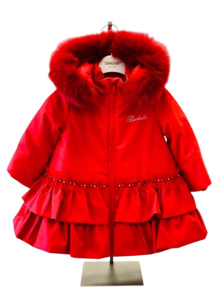 Girls Bimbalo Red Fur Hood Jacket and Pearl Trim